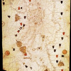 Особенно трудная проблема, ее даже можно назвать удивительной и противоречивой загадкой, выявилась при использовании плоской тригонометрии в то время, когда, согласно историческим данным, уже была известна сферическая тригонометрия. Почему же в проекции Пири Рейса мы находим, как указывают повторные исследования, признаки плоской трисонометрии, в то время как греческие географы после Гиппарха были уже знакомы с теорией сферической тригонометрии в картосоставлении? (Хотя, насколько нам известно, они не могли извлечь практическую пользу из теории.) И кажется маловероятным, что карта была нарисована при жизни Гиппарха, тогда, когда он завершил разработку плоской тригонометрии, но еще не приступил к ее сферической разновидности.