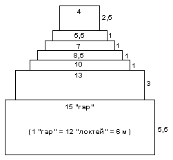 Мардук заявлял, что комплекс зиккуратов и храмов (Э.САГ.ИЛЬ) были построены в Вавилоне по его проекту, созданному согласно “письменам Всевышних Небес”. …семиступенчатый зиккурат имел в своем основании идеальный квадрат; первая ступень сооружения имела грани длиной 15 “гар” каждая. Каждая последующая ступень уступала предыдущей в размере площади и в высоте, за исключением последней – обители бога, – которая была гораздо выше. Общая высота зиккурата составляла также 15 “гар”, так что это сооружение не только имело идеальный квадрат в своем основании, но также представляло собой идеальный куб. Единица расстояния “гар”, использовавшаяся в этой системе измерений, равнялась 12 локтям, то есть приблизительно 6 метрам. Два исследователя, Г.Дж.Вуд и Л.К.Стеччини, обнаружили, что все предварительные расчеты параметров будущего зиккурата строились на числе 60, являвшемся также основой шумерской системы счисления. Так, каждая грань нижней ступени имела параметры 3х60 локтей, а их периметр равнялся 60 “гарам”.