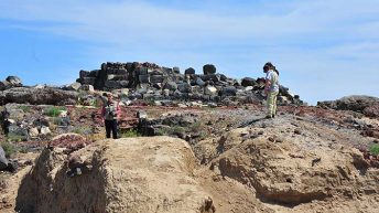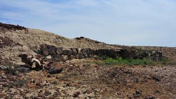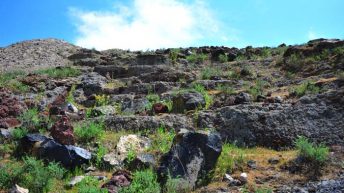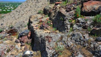 Стены из черного базальтового туфа резко выделяются на фоне красного туфа, из которого состоит сам холм.