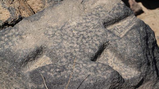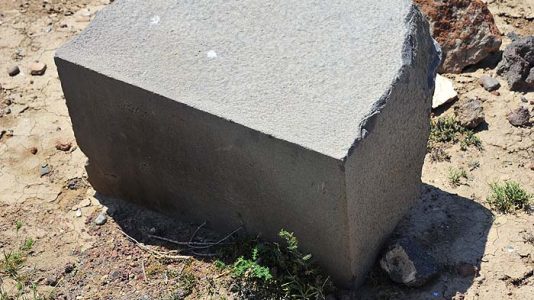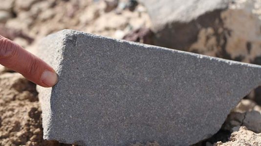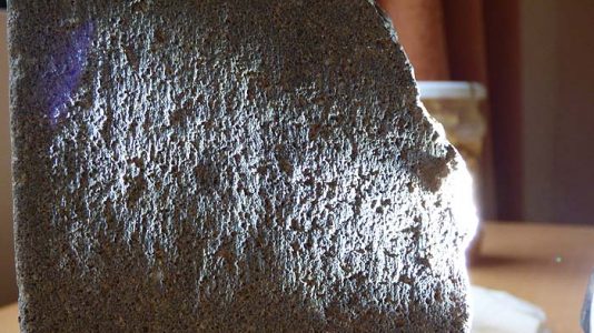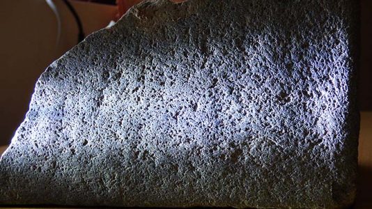Макросъемка образца (кусок блока серого цвета) под косым светом выявляет признаки ручной обработки, хотя невооруженным взглядом никаких неровностей не видно. Но окончательный вывод об отсутствии признаков машинных технологий на этом (и других подобных) обломке требует дополнительных исследований.