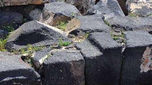 Из сохранившихся остатков стен из сырцового кирпича (возведены на внешней части основного комплекса) выглядывают обломки весьма хорошо обработанных блоков серого цвета (гранита или базальта). Обломки явно использовались в роли элементов, укрепляющих сердцевину сырцовых стен. Цельный брусок из этого же материала с такой же обработкой лежит в основании дверного проема, при этом на него опираются крупные блоки черного туфа, формирующие косяк двери. Их взаимное расположение и само положение бруска позволяет предположить, что брусок находится в основании дверного проема с момента первоначального строительства, И хотя происхождение обломков непонятно, есть основания предполагать, что они являются остатками первоначальной кладки давно разрушенного практически до основания сооружения.