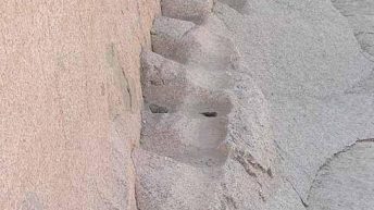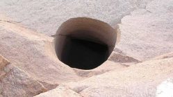4. Довольно глубокие “колодцы”-шурфы шириной чуть больше того, что нужно для того, чтобы стоял человек (диаметр немного более полуметра). Форма не столько круглая, сколько иногда ближе к квадратной (с закругленными углами). Края шурфов вроде бы ровные, но не так уж и всегда. Отнести форму шурфов к результату воздействия единственного бурения нельзя. Шурфов с десяток-полтора. Официальная версия: их пробивали для того, чтобы определить трещины в граните. Хотя в некоторых местах действительно шурфы сопровождают трещины, но таких шурфов не так уж и много; во-вторых, трещины в этих случаях итак видны вверху; и в-третьих, знание этих трещин никоим образом не использовано (нигде трещиной для упрощения работ не воспользовались, хотя есть и трещины, идущие почти строго вертикально, что значительно бы упростило работы по вырубке блоков). Даже если бы это было так, то каким это образом можно было сделать? Шурфы узкие, и человек так помещается лишь стоя. И работать там просто невозможно.