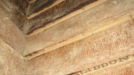 5. Черный налет начинается на каждом ряду перекрытия не сразу от более высокого ряда, а в 6-7 см от него – образуется светлая полоска. Версия: налет мог остаться от летучих мышей. Но сомнительно.