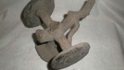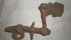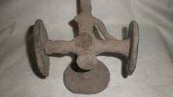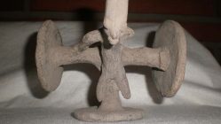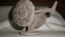 Но более всего нас поразила статуэтка “штангиста”, как мы ее условно назвали. Хотя “штанга”, пожалуй, больше напоминает ось с двумя колесами. И это в очередной раз вызывает вопрос в справедливости тезиса о том, что индейцы Мезоамерики не знали колеса…