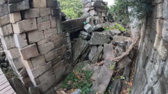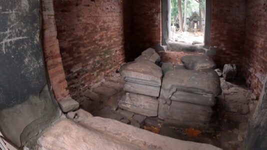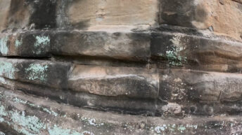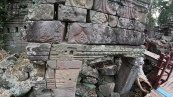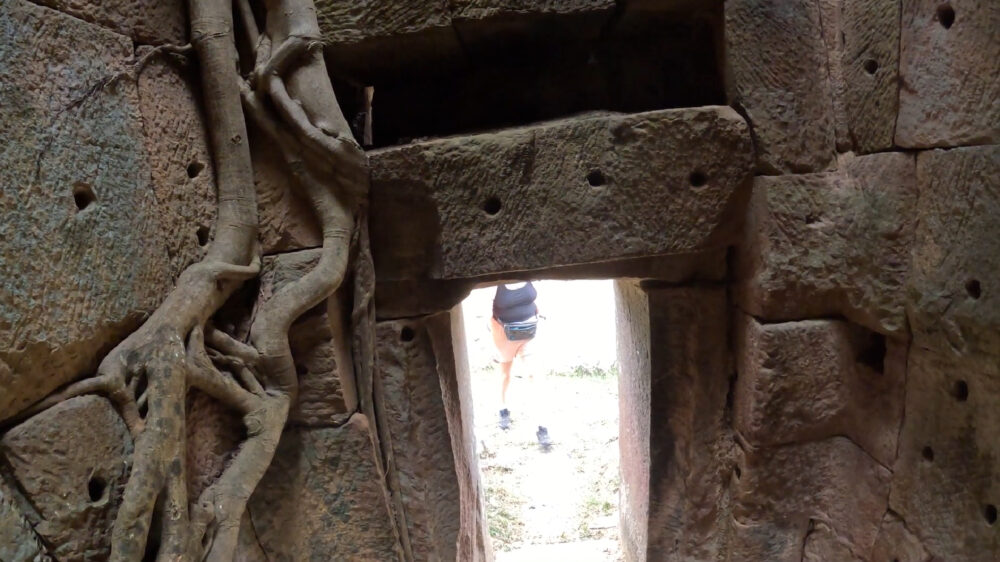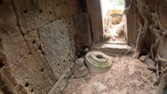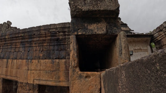 Второй момент, это пустоты над оконными и дверными перемычками, которые вырезались в каменных блоках, при строительстве и после его завершения были не видны. Сейчас их можно обнаружить в разобранных местах кладки, для чего делалась эта трудозатратная операция не до конца ясно. С инженерной точки зрения это уменьшение сечения каменной кладки и увеличение нагрузки на перемычку. Возможно, что в этих пустотах что-то находилось, однако кхмеры при вторичном использовании многие перемычки пробивали в поисках этих предметов.