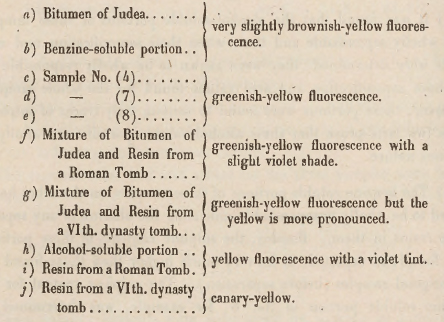 - Три рассматриваемых образца (№ 4, 7 и 8) показали одинаковую флуоресценцию, что подтверждает их одинаковый состав. Это также подтверждается тем, что их флуоресценция была почти аналогична искусственным смесям смолы и иудейского битума. Незначительное различие во флуоресценции между образцами и искусственной смесью объясняется использованием различных видов смол.