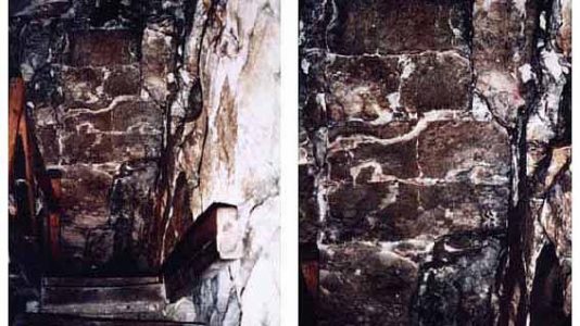То ли по эндогенным, то ли по экзогенным причинам, открытые для доступа помещения обладают повышенной влажностью и демонстрируют солевые отложения и разрушение каменных блоков. Обнаруженный позади “окна” маленький коридор, который отделен от влажных помещений тонким слоем небрежной каменной кладки, показывает то же самое ухудшение состояния. Напротив, совершенно закрытые и изолированные обнаруженные камеры почти не повреждены.