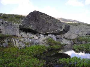 Не был ли этот примерно 50-ти тонный камень темного цвета, брошенный ледником среди светлых скал хребта Мончетундры, на россыпь камней возле ручья одним из прообразов сейдов? (фото-2004)