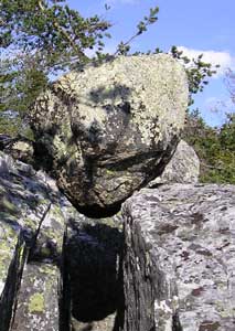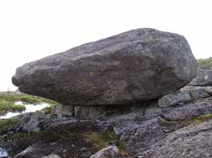 Другой вид того же валуна – отчетливо видно, что “подставки” – раздавленная валуном и вымытая часть породы. Рукотворное происхождение маловероятно. (фото-2004)