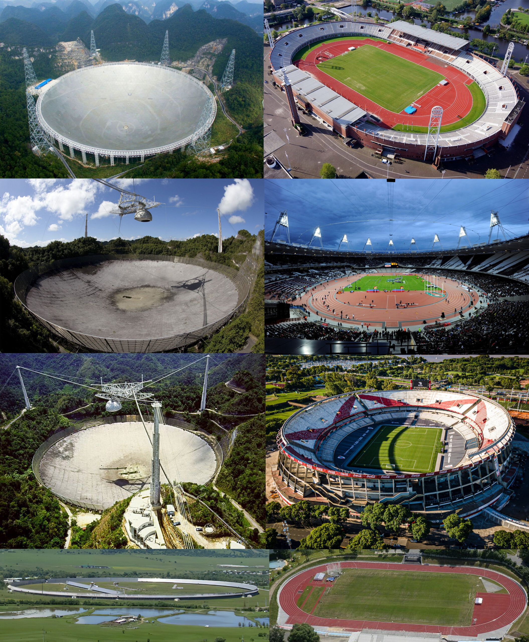 На фото сравнительные изображения крупнейших радиотелескопов со стадионами. Справа – стадионы, слева сверху вниз: китайский FAST (диаметр 500 м), пуэрториканский Аресибо (305 м), снова Аресибо с другого ракурса, и самый большой российский РАТАН-600 диаметром 576 метров.