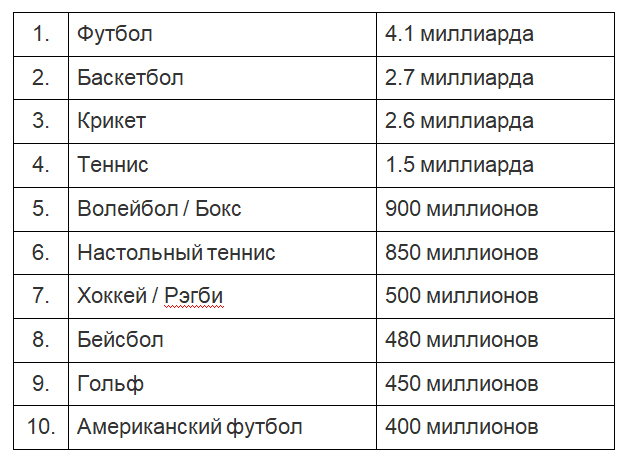Вот приблизительная статистика о количестве фанатов разных видов спорта: