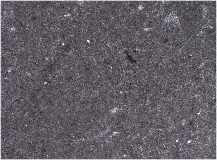 Описание: Мелкокристаллический известняк без следов органических остатков. Равномерно сложен микрокристаллами кальцита размером 1-10 мкм. Идентификация кальцита подтверждена рентгено-фазовым анализом. Местами в породе наблюдаются мелкие прожилки и линзочки, заполненные более крупнокристаллическим кальцитом.