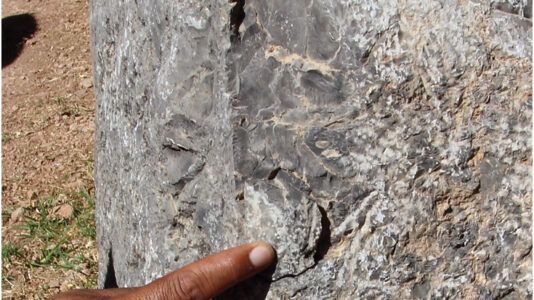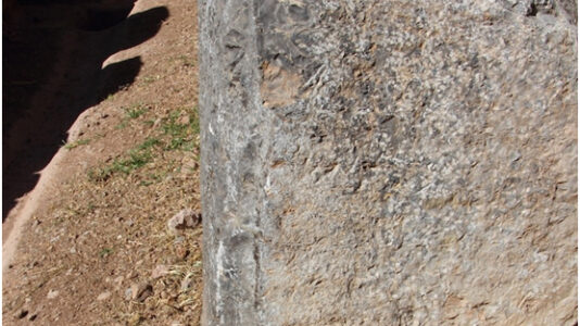 Фрагмент блока разрушенной в 2010 г. стены с обработанной (имеющей белые точки) поверхностью.