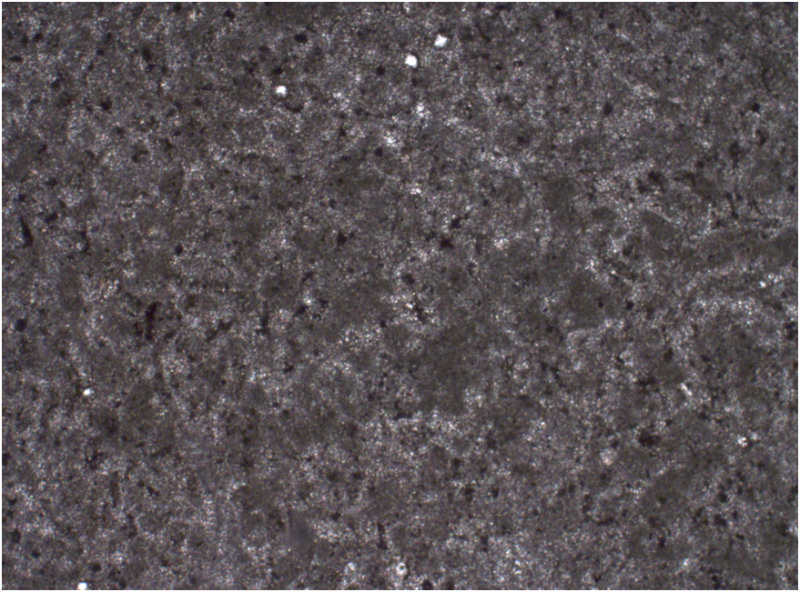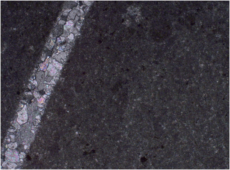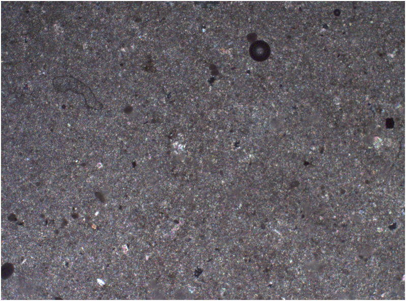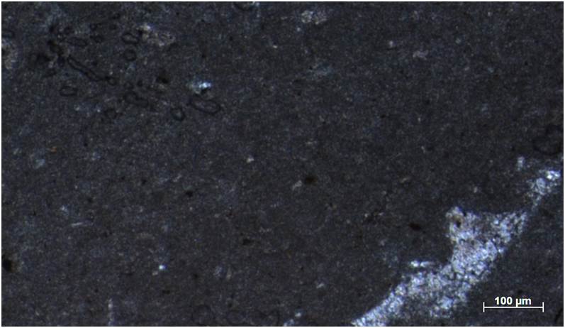 Описание: Мелкокристаллический известняк без следов органических остатков. Равномерно сложен микрокристаллами кальцита размером 1-10 мкм. Идентификация кальцита подтверждена рентгено-фазовым анализом. Местами в породе наблюдаются мелкие прожилки и линзочки, заполненные более крупнокристаллическим кальцитом.