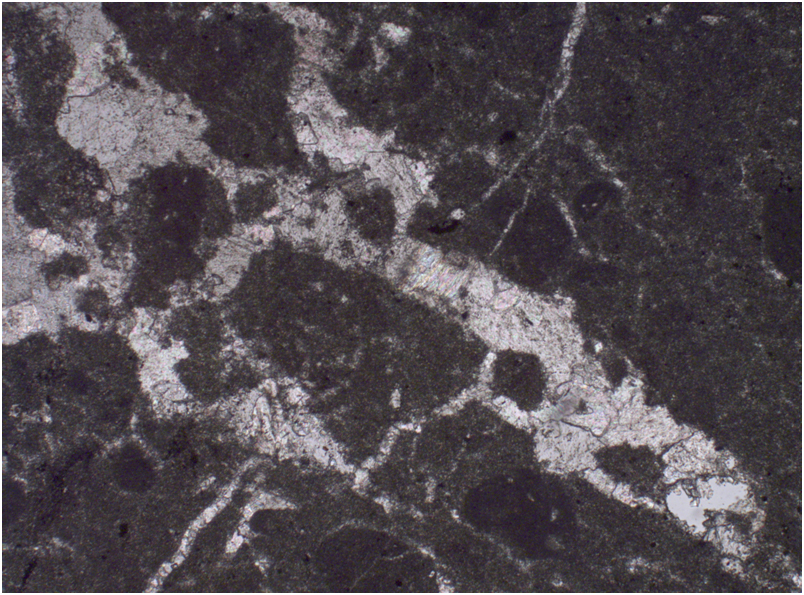 Описание: Мелкокристаллический известняк без следов органических остатков. Сильно трещиноват и перекристаллизован.