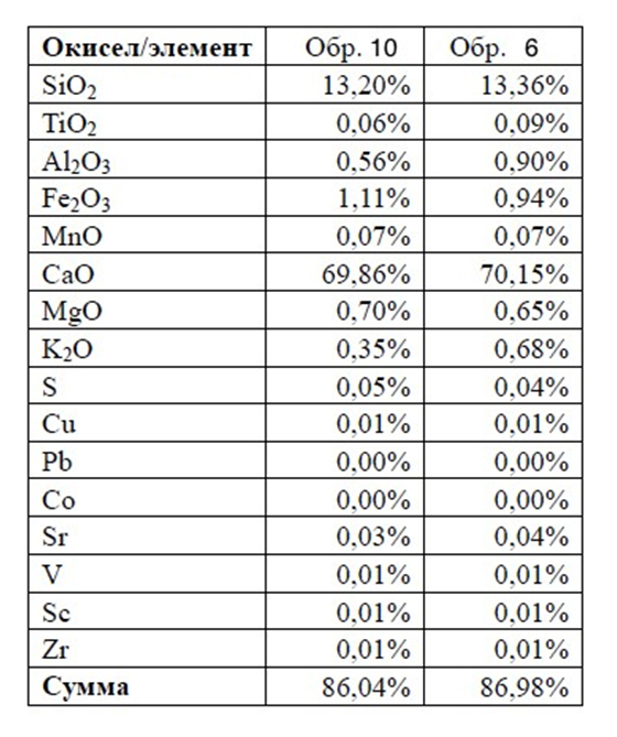 Рентгено-флюоресцентный анализ выявил практически абсолютное сходство химического состава образцов 10 и 6 (из карьера и материал блока стены).