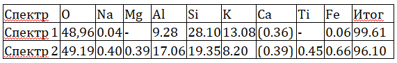 Присутствуют тонкие зерна кварца и калиевых полевых шпатов, обычно выветрелых а также единичные зерна оксидов (гидроксидов?) железа неправильной формы размером 20-30 мкм и кристаллики KCl.
