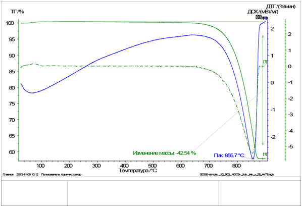 На кривой ДТА (дифференциальный термический анализ) выделяется один тепловой эндотермический эффект. Максимум пика приходится на 860 градусов  Цельсия. Он соответствует процессу разложения кальцита. CaCO3 разлагается на CaO и CO2. При этом происходит потеря массы на 42,54%, что видно на термогравиметрической кривой (ТГ). Кривая ДТА является типичной для природного кальцита.